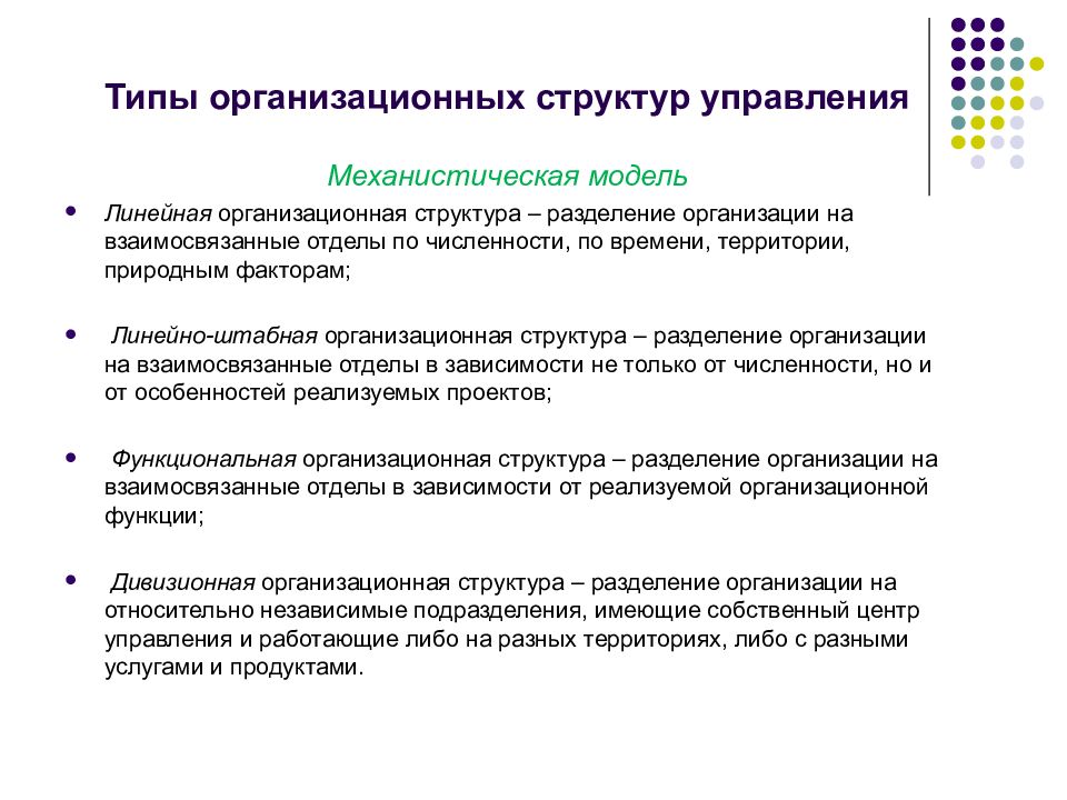 Типы организационных структур управления Механистическая модель Линейная организационная структура – разделение организации на взаимосвязанные отделы по численности, по времени, территории, природным факторам ; Линейно-штабная организационная структура – разделение организации на взаимосвязанные отделы в зависимости не только от численности, но и от особенностей реализуемых проектов ; Функциональная организационная структура – разделение организации на взаимосвязанные отделы в зависимости от реализуемой организационной функции ; Дивизионная организационная структура – разделение организации на относительно независимые подразделения, имеющие собственный центр управления и работающие либо на разных территориях, либо с разными услугами и продуктами.