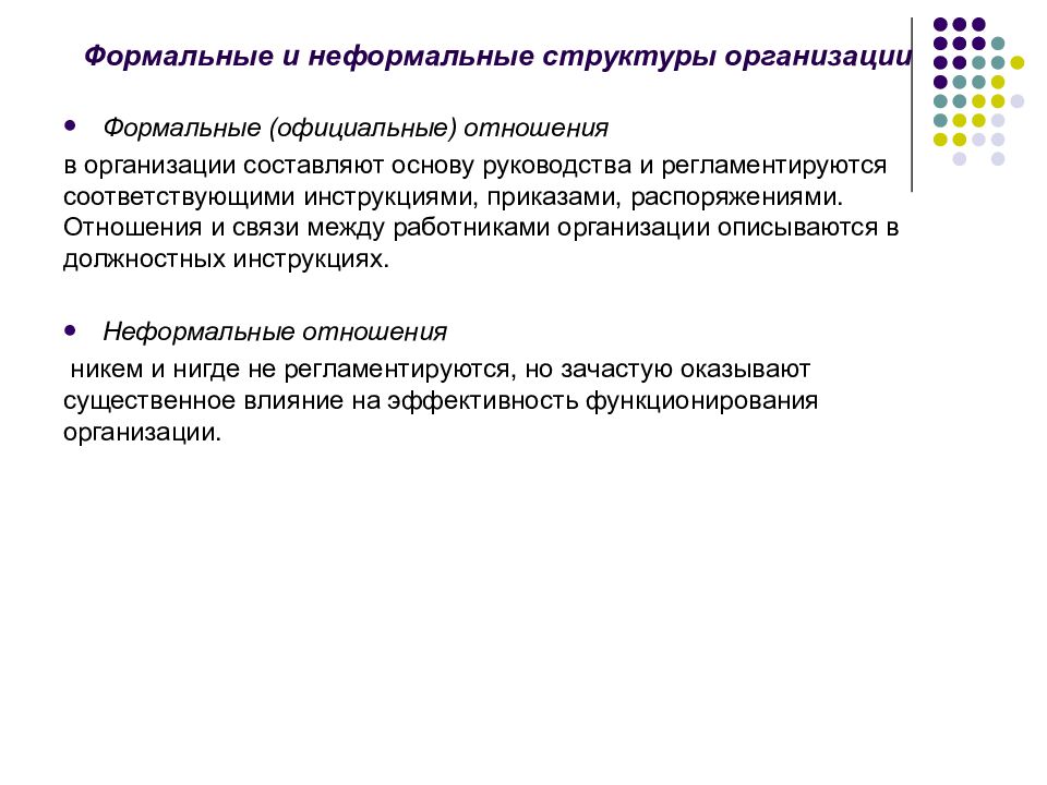 Формальные и неформальные структуры организации Формальные (официальные) отношения в организации составляют основу руководства и регламентируются соответствующими инструкциями, приказами, распоряжениями. Отношения и связи между работниками организации описываются в должностных инструкциях. Неформальные отношения никем и нигде не регламентируются, но зачастую оказывают существенное влияние на эффективность функционирования организации.
