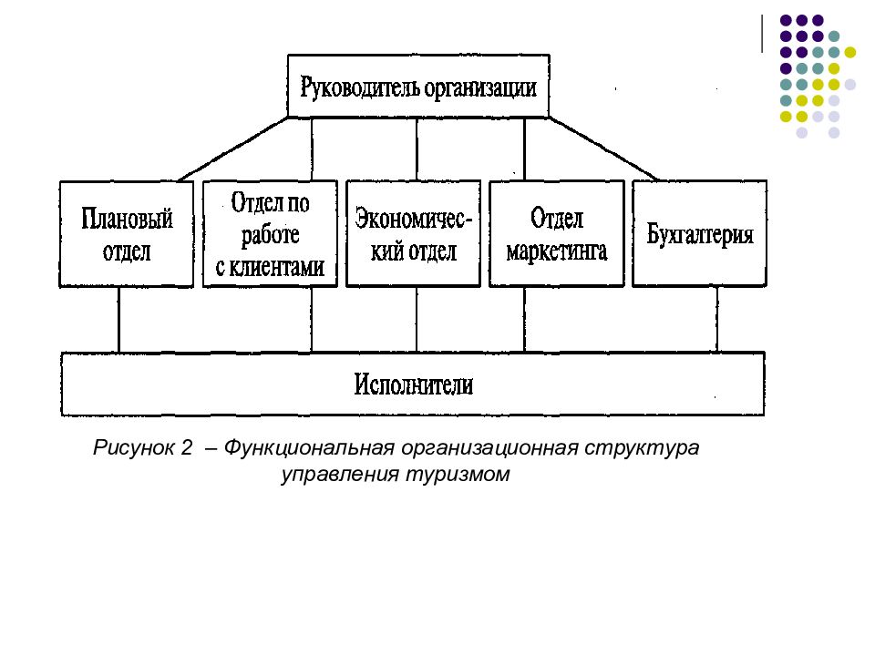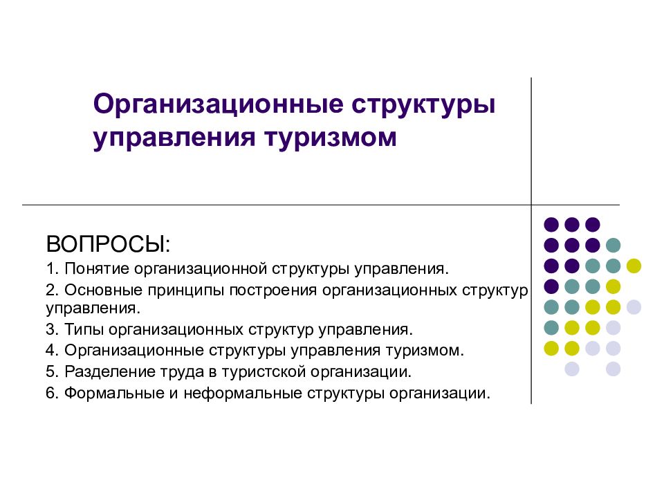ВОПРОСЫ: 1. Понятие организационной структуры управления. 2. Основные принципы построения организационных структур управления. 3. Типы организационных структур управления. 4. Организационные структуры управления туризмом. 5. Разделение труда в туристской организации. 6. Формальные и неформальные структуры организации.