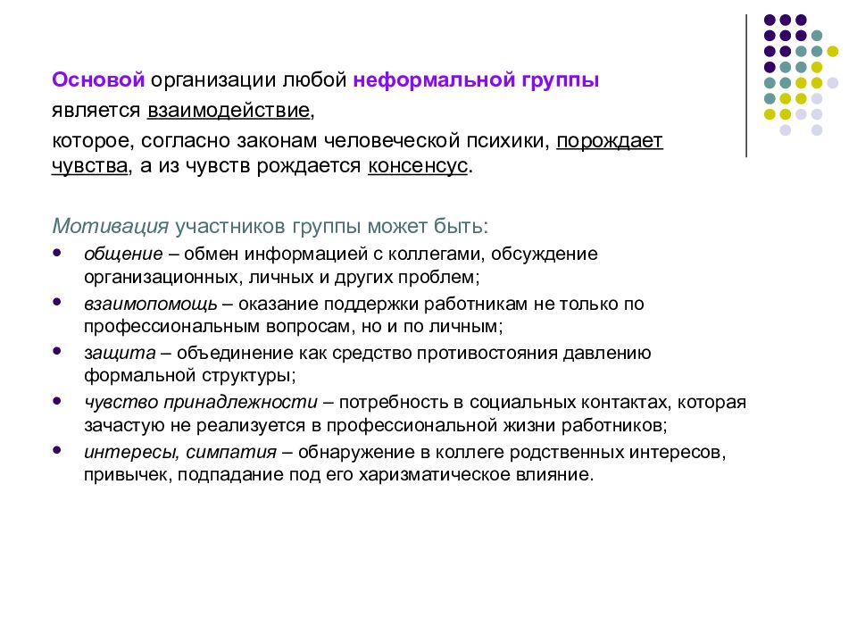 Основой организации любой неформальной группы является взаимодействие, которое, согласно законам человеческой психики, порождает чувства, а из чувств рождается консенсус. Мотивация участников группы может быть: общение – обмен информацией с коллегами, обсуждение организационных, личных и других проблем; взаимопомощь – оказание поддержки работникам не только по профессиональным вопросам, но и по личным; з ащита – объединение как средство противостояния давлению формальной структуры; чувство принадлежности – потребность в социальных контактах, которая зачастую не реализуется в профессиональной жизни работников; интересы, симпатия – обнаружение в коллеге родственных интересов, привычек, подпадание под его харизматическое влияние.