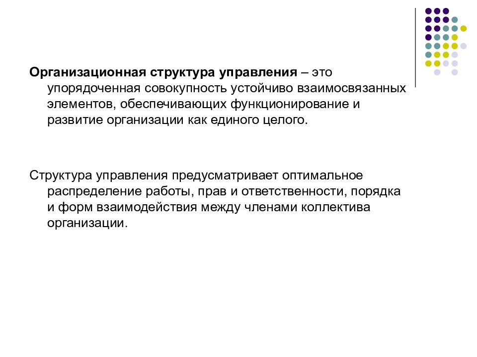 Организационная структура управления – это упорядоченная совокупность устойчиво взаимосвязанных элементов, обеспечивающих функционирование и развитие организации как единого целого. Структура управления предусматривает оптимальное распределение работы, прав и ответственности, порядка и форм взаимодействия между членами коллектива организации.