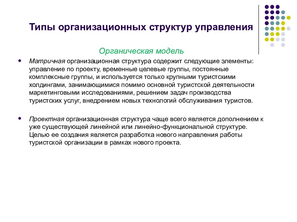 Типы организационных структур управления Органическая модель Матричная организационная структура содержит следующие элементы: управление по проекту, временные целевые группы, постоянные комплексные группы, и используется только крупными туристскими холдингами, занимающимися помимо основной туристской деятельности маркетинговыми исследованиями, решением задач производства туристских услуг, внедрением новых технологий обслуживания туристов. Проектная организационная структура чаще всего является дополнением к уже существующей линейной или линейно-функциональной структуре. Целью ее создания является разработка нового направления работы туристской организации в рамках нового проекта.