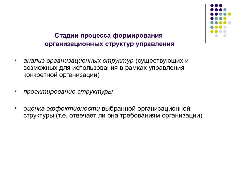 Стадии процесса формирования организационных структур управления анализ организационных структур (существующих и возможных для использования в рамках управления конкретной организации ) проектирование структуры оценка эффективности выбранной организационной структуры (т.е. отвечает ли она требованиям организации )