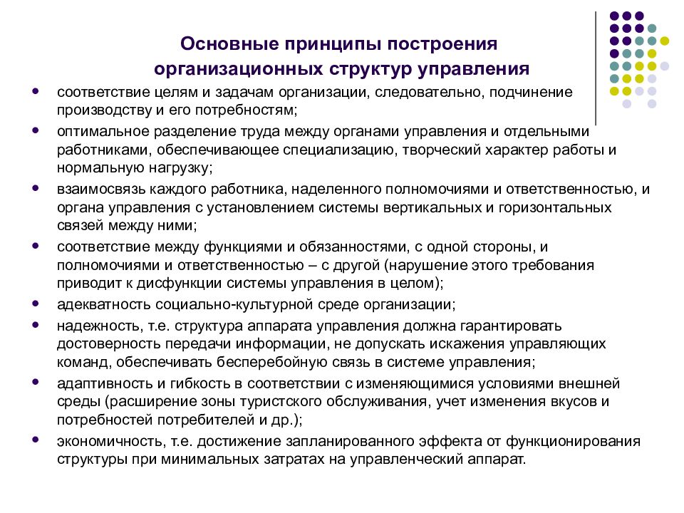 Основные принципы построения организационных структур управления соответствие целям и задачам организации, следовательно, подчинение производству и его потребностям; оптимальное разделение труда между органами управления и отдельными работниками, обеспечивающее специализацию, творческий характер работы и нормальную нагрузку; взаимосвязь каждого работника, наделенного полномочиями и ответственностью, и органа управления с установлением системы вертикальных и горизонтальных связей между ними; соответствие между функциями и обязанностями, с одной стороны, и полномочиями и ответственностью – с другой (нарушение этого требования приводит к дисфункции системы управления в целом); адекватность социально-культурной среде организации; надежность, т.е. структура аппарата управления должна гарантировать достоверность передачи информации, не допускать искажения управляющих команд, обеспечивать бесперебойную связь в системе управления; адаптивность и гибкость в соответствии с изменяющимися условиями внешней среды (расширение зоны туристского обслуживания, учет изменения вкусов и потребностей потребителей и др.); экономичность, т.е. достижение запланированного эффекта от функционирования структуры при минимальных затратах на управленческий аппарат.