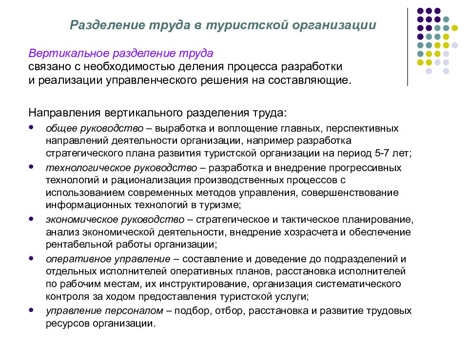 Разделение труда в туристской организации Вертикальное разделение труда связано с необходимостью деления процесса разработки и реализации управленческого решения на составляющие. Направления вертикального разделения труда: общее руководство – выработка и воплощение главных, перспективных направлений деятельности организации, например разработка стратегического плана развития туристской организации на период 5-7 лет; технологическое руководство – разработка и внедрение прогрессивных технологий и рационализация производственных процессов с использованием современных методов управления, совершенствование информационных технологий в туризме; экономическое руководство – стратегическое и тактическое планирование, анализ экономической деятельности, внедрение хозрасчета и обеспечение рентабельной работы организации; оперативное управление – составление и доведение до подразделений и отдельных исполнителей оперативных планов, расстановка исполнителей по рабочим местам, их инструктирование, организация систематического контроля за ходом предоставления туристской услуги; управление персоналом – подбор, отбор, расстановка и развитие трудовых ресурсов организации.