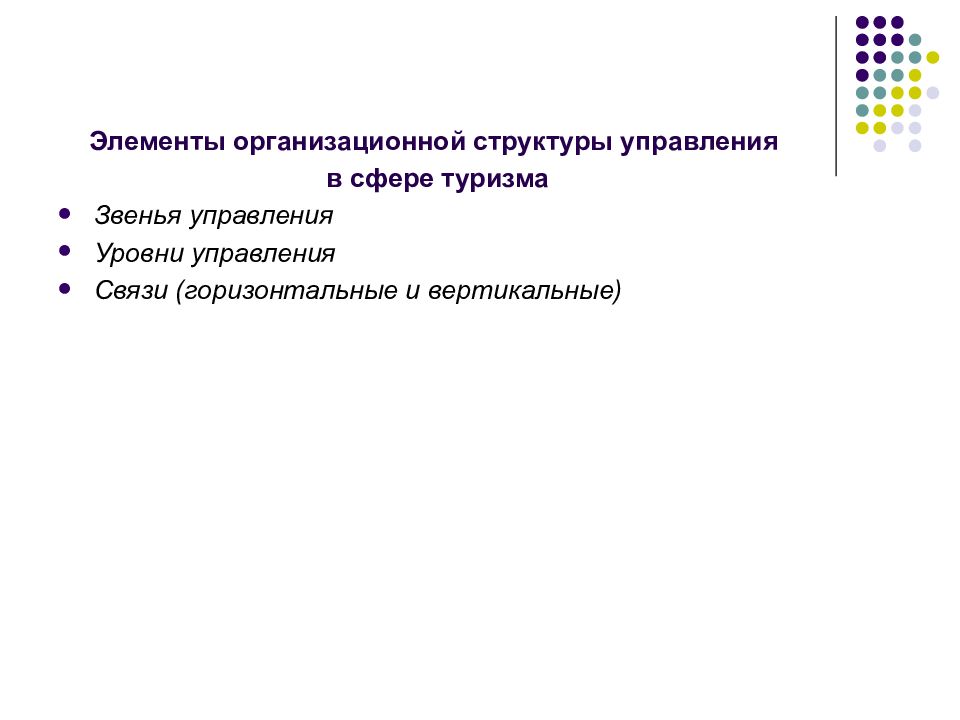 Элементы организационной структуры управления в сфере туризма Звенья управления Уровни управления Связи (горизонтальные и вертикальные)