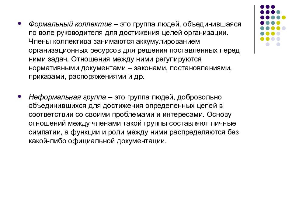 Формальный коллектив – это группа людей, объединившаяся по воле руководителя для достижения целей организации. Члены коллектива занимаются аккумулированием организационных ресурсов для решения поставленных перед ними задач. Отношения между ними регулируются нормативными документами – законами, постановлениями, приказами, распоряжениями и др. Неформальная группа – это группа людей, добровольно объединившихся для достижения определенных целей в соответствии со своими проблемами и интересами. Основу отношений между членами такой группы составляют личные симпатии, а функции и роли между ними распределяются без какой-либо официальной документации.