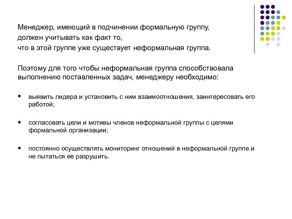 Менеджер, имеющий в подчинении формальную группу, должен учитывать как факт то, что в этой группе уже существует неформальная группа. Поэтому для того чтобы неформальная группа способствовала выполнению поставленных задач, менеджеру необходимо : выявить лидера и установить с ним взаимоотношения, заинтересовать его работой; согласовать цели и мотивы членов неформальной группы с целями формальной организации ; постоянно осуществлять мониторинг отношений в неформальной группе и не пытаться ее разрушить.