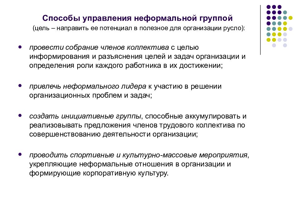 Способы управления неформальной группой (цель – направить ее потенциал в полезное для организации русло): провести собрание членов коллектива с целью информирования и разъяснения целей и задач организации и определения роли каждого работника в их достижении; привлечь неформального лидера к участию в решении организационных проблем и задач; создать инициативные группы, способные аккумулировать и реализовывать предложения членов трудового коллектива по совершенствованию деятельности организации; проводить спортивные и культурно-массовые мероприятия, укрепляющие неформальные отношения в организации и формирующие корпоративную культуру.