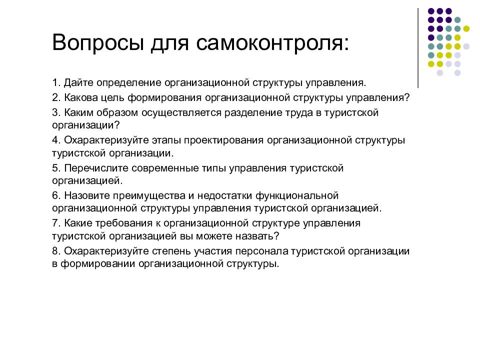 Вопросы для самоконтроля: 1. Дайте определение организационной структуры управления. 2. Какова цель формирования организационной структуры управления? 3. Каким образом осуществляется разделение труда в туристской организации? 4. Охарактеризуйте этапы проектирования организационной структуры туристской организации. 5. Перечислите современные типы управления туристской организацией. 6. Назовите преимущества и недостатки функциональной организационной структуры управления туристской организацией. 7. Какие требования к организационной структуре управления туристской организацией вы можете назвать? 8. Охарактеризуйте степень участия персонала туристской организации в формировании организационной структуры.