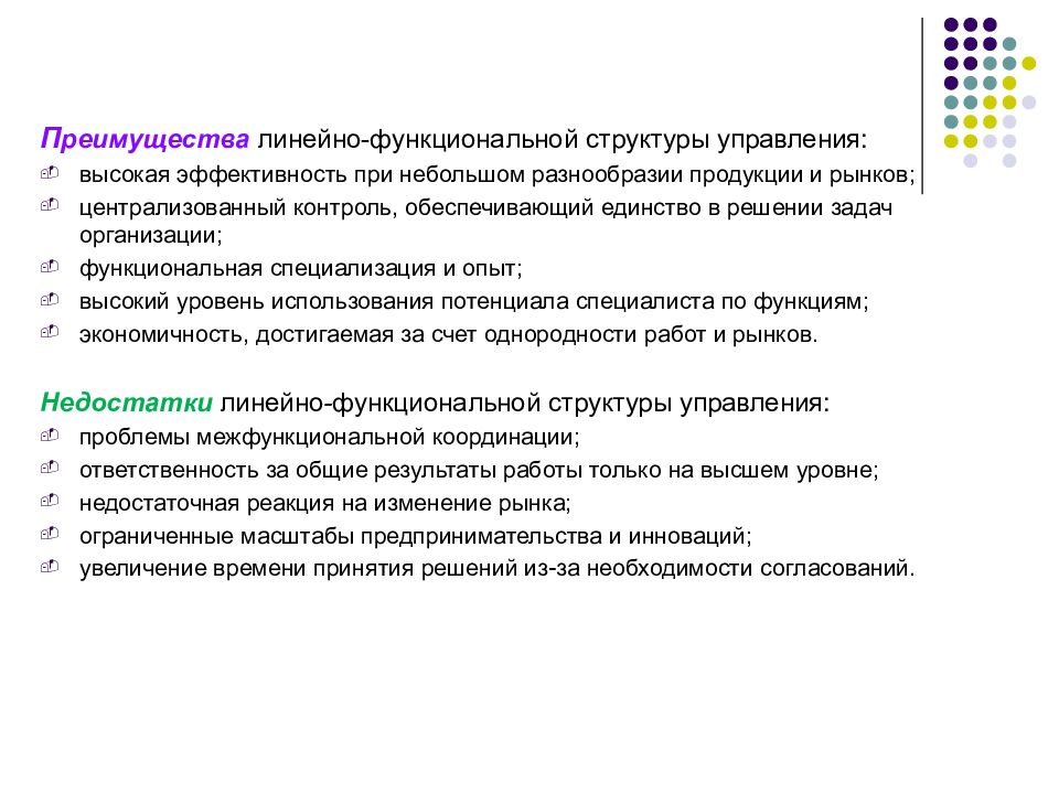 П реимущества линейно-функциональной структуры управления: высокая эффективность при небольшом разнообразии продукции и рынков ; централизованный контроль, обеспечивающий единство в решении задач организации; функциональная специализация и опыт; высокий уровень использования потенциала специалиста по функциям; экономичность, достигаемая за счет однородности работ и рынков. Недостатки линейно - функциональной структуры управления: проблемы межфункциональной координации; ответственность за общие результаты работы только на высшем уровне; недостаточная реакция на изменение рынка; ограниченные масштабы предпринимательства и инноваций; увеличение времени принятия решений из-за необходимости согласований.