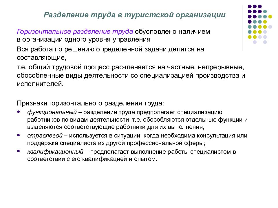 Разделение труда в туристской организации Горизонтальное разделение труда обусловлено наличием в организации одного уровня управления Вся работа по решению определенной задачи делится на составляющие, т.е. общий трудовой процесс расчленяется на частные, непрерывные, обособленные виды деятельности со специализацией производства и исполнителей. Признаки горизонтального разделения труда: функциональный – разделение труда предполагает специализацию работников по видам деятельности, т.е. обособляются отдельные функции и выделяются соответствующие работники для их выполнения; отраслевой – используется в ситуации, когда необходима консультация или поддержка специалиста из другой профессиональной сферы ; квалификационный – предполагает выполнение работы специалистом в соответствии с его квалификацией и опытом.