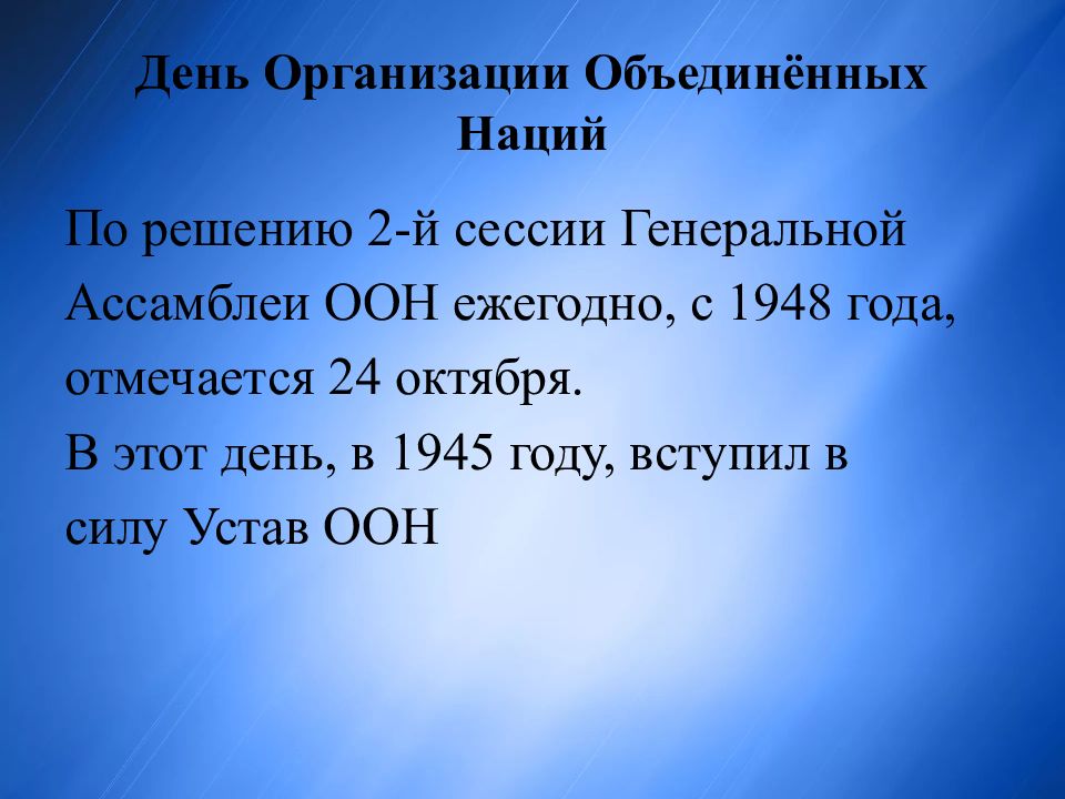 П о решению 2-й сессии Генеральной Ассамблеи ООН ежегодно, с 1948 года, отмечается 24 октября. В этот день, в 1945 году, вступил в силу Устав ООН
