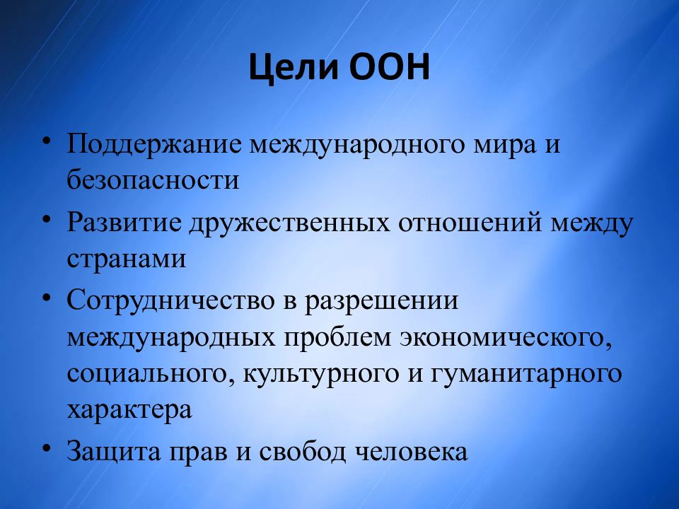 Поддержание международного мира и безопасности Развитие дружественных отношений между странами Сотрудничество в разрешении международных проблем экономического, социального, культурного и гуманитарного характера Защита прав и свобод человека