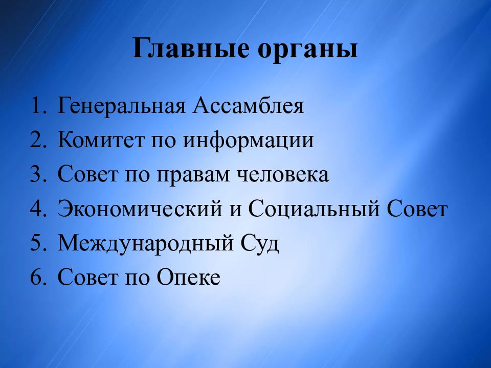Генеральная Ассамблея Комитет по информации Совет по правам человека Экономический и Социальный Совет Международный Суд Совет по Опеке