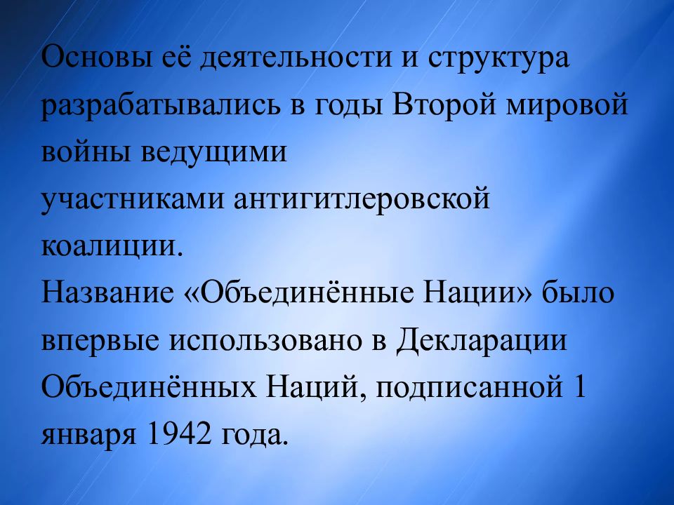 Основы её деятельности и структура разрабатывались в годы Второй мировой войны ведущими участниками антигитлеровской коалиции. Название «Объединённые Нации» было впервые использовано в Декларации Объединённых Наций, подписанной 1 января 1942 года.
