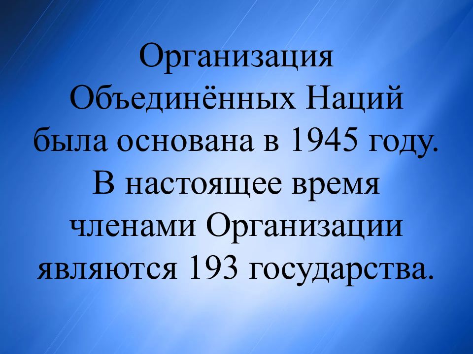 Организация Объединённых Наций была основана в 1945 году. В настоящее время членами Организации являются 193 государства.