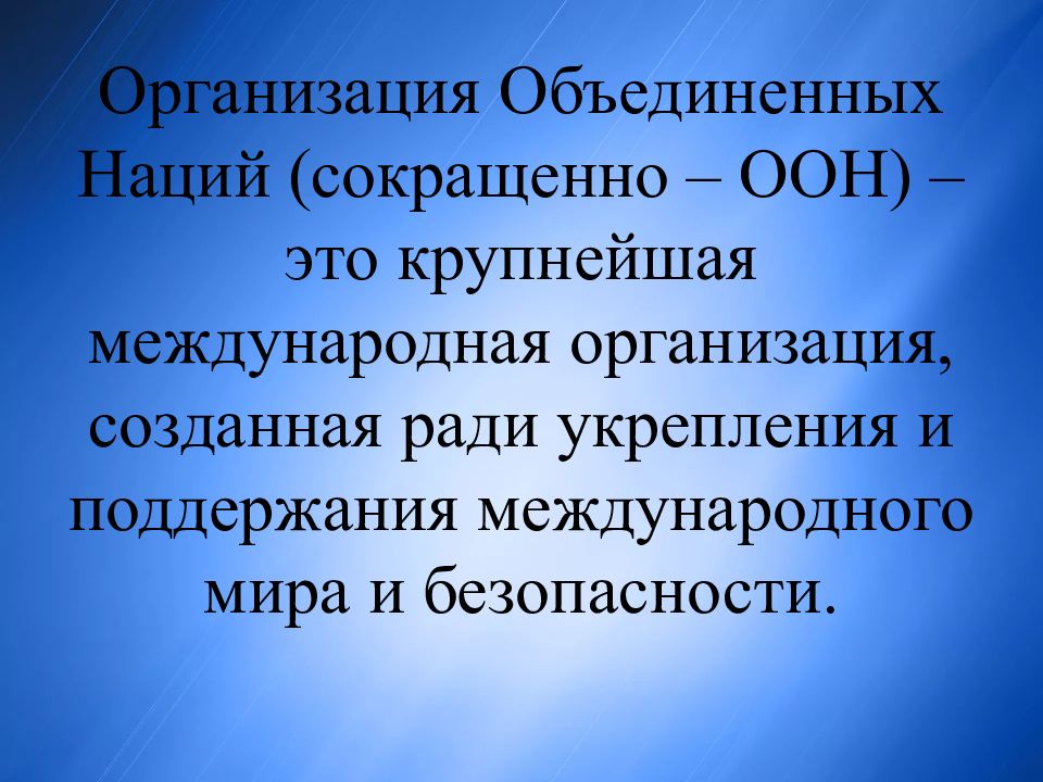 Организация Объединенных Наций (сокращенно – ООН) – это крупнейшая международная организация, созданная ради укрепления и поддержания международного мира и безопасности.