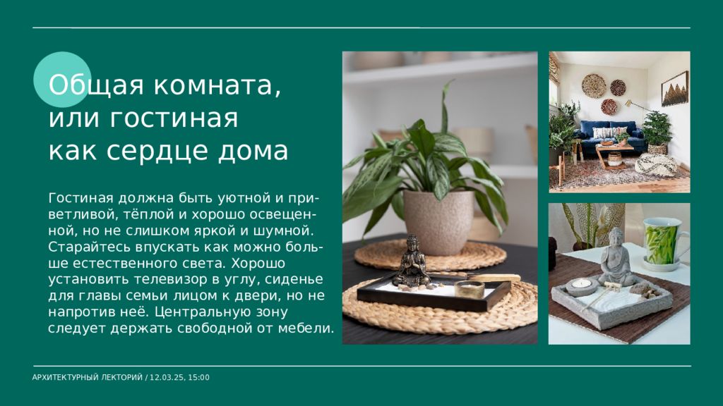 АРХИТЕКТУРНЫЙ ЛЕКТОРИЙ / 12.03.25, 15:00 Общая комната, или гостиная как сердце дома Гостиная должна быть уютной и при- ветливой, тёплой и хорошо освещен-ной, но не слишком яркой и шумной. Старайтесь впускать как можно боль- ше естественного света. Хорошо установить телевизор в углу, сиденье для главы семьи лицом к двери, но не напротив неё. Центральную зону следует держать свободной от мебели.