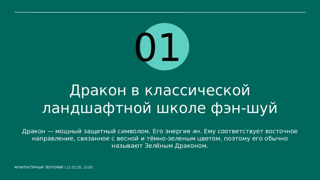 01 Дракон в классической ландшафтной школе фэн-шуй Дракон — мощный защитный символом. Его энергия ян. Ему соответствует восточное направление, связанное с весной и тёмно-зеленым цветом, поэтому его обычно называют Зелёным Драконом. АРХИТЕКТУРНЫЙ ЛЕКТОРИЙ / 12.03.25, 15:00