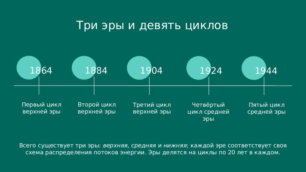 Три эры и девять циклов 1864 Первый цикл верхней эры 1884 Второй цикл верхней эры 1904 Третий цикл верхней эры 1924 Четвёртый цикл средней эры 1944 Пятый цикл средней эры Всего существует три эры: верхняя, средняя и нижняя ; каждой эре соответствует своя схема распределения потоков энергии. Эры делятся на циклы по 20 лет в каждом.