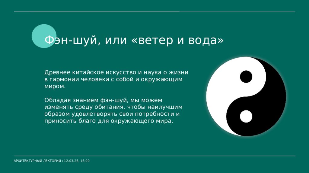 Фэн-шуй, или «ветер и вода» Древнее китайское искусство и наука о жизни в гармонии человека с собой и окружающим миром. Обладая знанием фэн-шуй, мы можем изменять среду обитания, чтобы наилучшим образом удовлетворять свои потребности и приносить благо для окружающего мира. АРХИТЕКТУРНЫЙ ЛЕКТОРИЙ / 12.03.25, 15:00