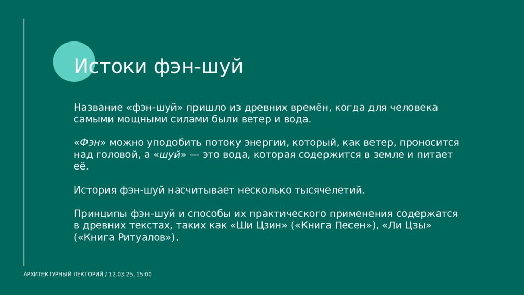 Название « фэн-шуй » пришло из древних времён, когда для человека самыми мощными силами были ветер и вода. « Фэн » можно уподобить потоку энергии, который, как ветер, проносится над головой, а « шуй » — это вода, которая содержится в земле и питает её. История фэн-шуй насчитывает несколько тысячелетий. Принципы фэн-шуй и способы их практического применения содержатся в древних текстах, таких как «Ши Цзин» («Книга Песен»), «Ли Цзы » («Книга Ритуалов»). Истоки фэн-шуй АРХИТЕКТУРНЫЙ ЛЕКТОРИЙ / 12.03.25, 15:00