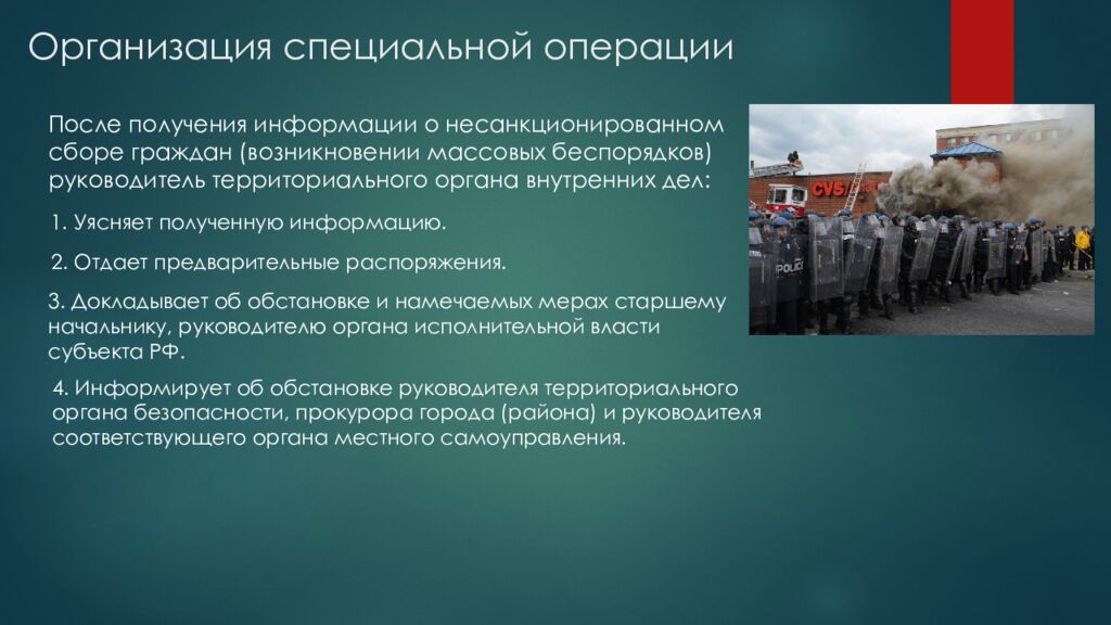 После получения информации о несанкционированном сборе граждан (возникновении массовых беспорядков) руководитель территориального органа внутренних дел : 1. Уясняет полученную информацию. 2. Отдает предварительные распоряжения. 3. Докладывает об обстановке и намечаемых мерах старшему начальнику, руководителю органа исполнительной власти субъекта РФ. 4. Информирует об обстановке руководителя территориального органа безопасности, прокурора города (района) и руководителя соответствующего органа местного самоуправления.