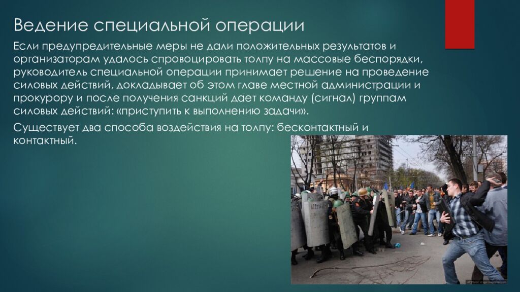 Если предупредительные меры не дали положительных результатов и организаторам удалось спровоцировать толпу на массовые беспорядки, руководитель специальной операции принимает решение на проведение силовых действий, докладывает об этом главе местной администрации и прокурору и после получения санкций дает команду (сигнал) группам силовых действий: «приступить к выполнению задачи». Существует два способа воздействия на толпу: бесконтактный и контактный.