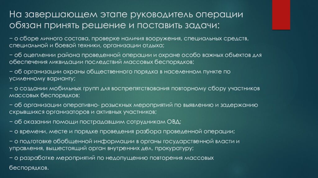 − о сборе личного состава, проверке наличия вооружения, специальных средств, специальной и боевой техники, организации отдыха; − об оцеплении района проведенной операции и охране особо важных объектов для обеспечения ликвидации последствий массовых беспорядков; − об организации охраны общественного порядка в населенном пункте по усиленному варианту ; − о создании мобильных групп для воспрепятствования повторному сбору участников массовых беспорядков ; − об организации оперативно- розыскных мероприятий по выявлению и задержанию скрывшихся организаторов и активных участников; − об оказании помощи пострадавшим сотрудникам ОВД ; − о времени, месте и порядке проведения разбора проведенной операции; − о подготовке обобщенной информации в органы государственной власти и управления, вышестоящий орган внутренних дел, прокуратуру; − о разработке мероприятий по недопущению повторения массовых беспорядков.