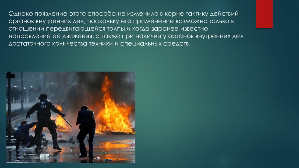 Однако появление этого способа не изменило в корне тактику действий органов внутренних дел, поскольку его применение возможно только в отношении передвигающейся толпы и когда заранее известно направление ее движения, а также при наличии у органов внутренних дел достаточного количества техники и специальных средств.