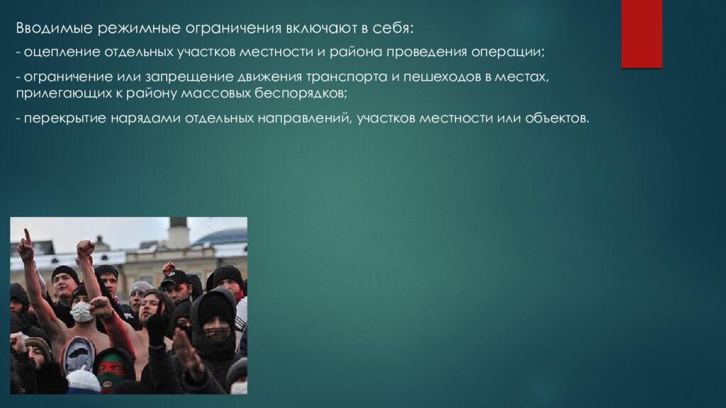 Вводимые режимные ограничения включают в себя: - оцепление отдельных участков местности и района проведения операции ; - ограничение или запрещение движения транспорта и пешеходов в местах, прилегающих к району массовых беспорядков; - перекрытие нарядами отдельных направлений, участков местности или объектов.