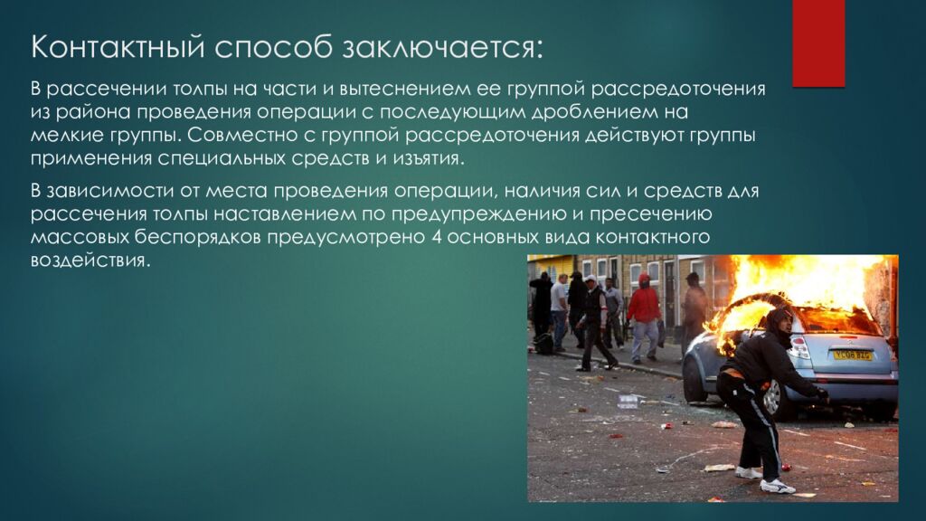 В рассечении толпы на части и вытеснением ее группой рассредоточения из района проведения операции с последующим дроблением на мелкие группы. Совместно с группой рассредоточения действуют группы применения специальных средств и изъятия. В зависимости от места проведения операции, наличия сил и средств для рассечения толпы наставлением по предупреждению и пресечению массовых беспорядков предусмотрено 4 основных вида контактного воздействия.