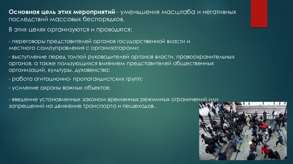 Основная цель этих мероприятий - уменьшения масштаба и негативных последствий массовых беспорядков. В этих целях организуются и проводятся: - переговоры представителей органов государственной власти и местного самоуправления с организаторами; - выступление перед толпой руководителей органов власти, правоохранительных органов, а также пользующихся влиянием представителей общественных организаций, культуры, духовенства; - работа агитационно- пропагандистских групп; - усиление охраны важных объектов; - введение установленных законом временных режимных ограничений или запрещений на движение транспорта и пешеходов.