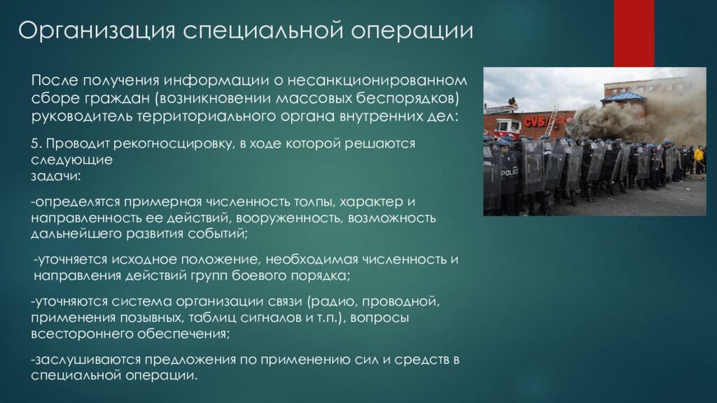 После получения информации о несанкционированном сборе граждан (возникновении массовых беспорядков) руководитель территориального органа внутренних дел : 5. Проводит рекогносцировку, в ходе которой решаются следующие задачи: -определятся примерная численность толпы, характер и направленность ее действий, вооруженность, возможность дальнейшего развития событий; -уточняется исходное положение, необходимая численность и направления действий групп боевого порядка; -уточняются система организации связи (радио, проводной, применения позывных, таблиц сигналов и т.п.), вопросы всестороннего обеспечения ; -заслушиваются предложения по применению сил и средств в специальной операции.