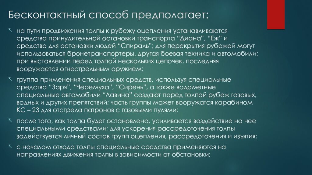 на пути продвижения толпы к рубежу оцепления устанавливаются средства принудительной остановки транспорта “Диана”, “Еж” и средство для остановки людей “Спираль”; для перекрытия рубежей могут использоваться бронетранспортеры, другая боевая техника и автомобили; при выставлении перед толпой нескольких цепочек, последняя вооружается огнестрельным оружием ; группа применения специальных средств, используя специальные средства “Заря”, “Черемуха”, “Сирень”, а также водометные специальные автомобили “Лавина” создают перед толпой рубеж газовых, водных и других препятствий; часть группы может вооружатся карабином КС – 23 для отстрела патронов с газовыми пулями ; после того, как толпа будет остановлена, усиливается воздействие на нее специальными средствами; для ускорения рассредоточения толпы задействуется личный состав групп оцепления, рассредоточения и изъятия ; с началом отхода толпы специальные средства применяются на направлениях движения толпы в зависимости от обстановки;