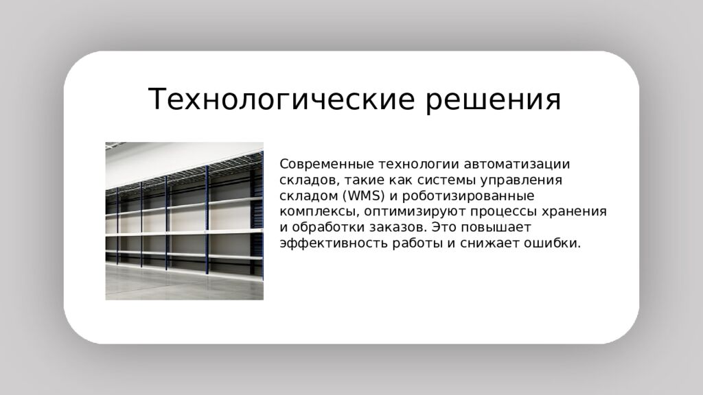 Технологические решения Современные технологии автоматизации складов, такие как системы управления складом (WMS) и роботизированные комплексы, оптимизируют процессы хранения и обработки заказов. Это повышает эффективность работы и снижает ошибки.