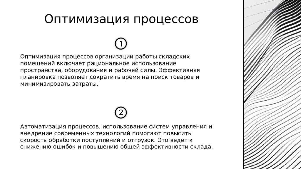 Оптимизация процессов организации работы складских помещений включает рациональное использование пространства, оборудования и рабочей силы. Эффективная планировка позволяет сократить время на поиск товаров и минимизировать затраты. Автоматизация процессов, использование систем управления и внедрение современных технологий помогают повысить скорость обработки поступлений и отгрузок. Это ведет к снижению ошибок и повышению общей эффективности склада.