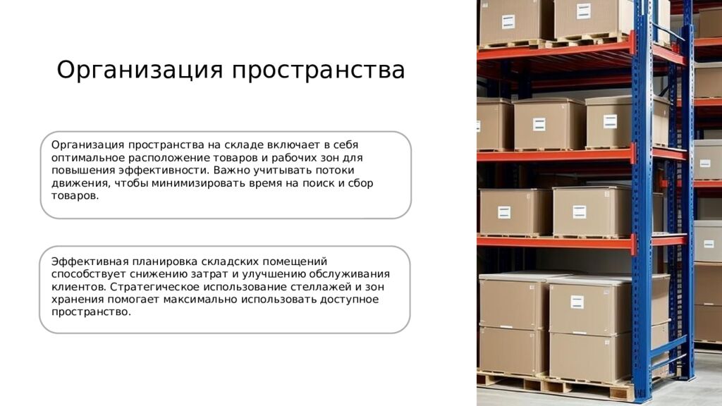 Организация пространства на складе включает в себя оптимальное расположение товаров и рабочих зон для повышения эффективности. Важно учитывать потоки движения, чтобы минимизировать время на поиск и сбор товаров. Эффективная планировка складских помещений способствует снижению затрат и улучшению обслуживания клиентов. Стратегическое использование стеллажей и зон хранения помогает максимально использовать доступное пространство.