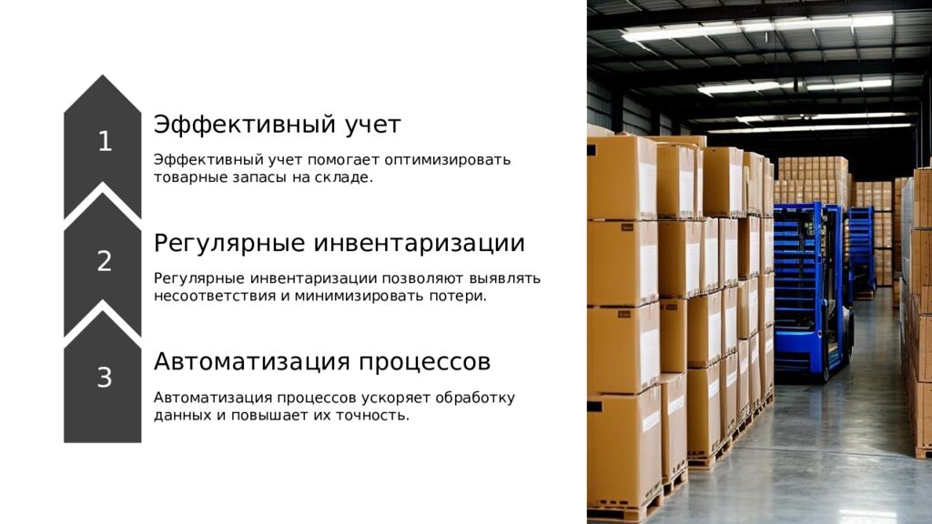 Эффективный учет Регулярные инвентаризации Автоматизация процессов Эффективный учет помогает оптимизировать товарные запасы на складе. Регулярные инвентаризации позволяют выявлять несоответствия и минимизировать потери. Автоматизация процессов ускоряет обработку данных и повышает их точность.