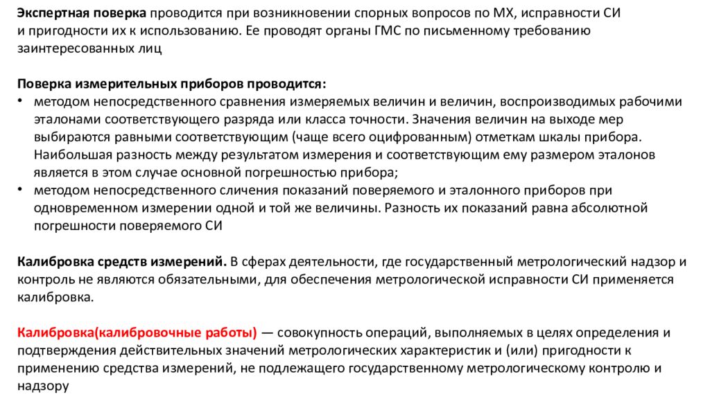 Экспертная поверка проводится при возникновении спорных вопросов по MX, исправности СИ и пригодности их к использованию. Ее проводят органы ГМС по письменному требованию заинтересованных лиц Поверка измерительных приборов проводится: методом непосредственного сравнения измеряемых величин и величин, воспроизводимых рабочими эталонами соответствующего разряда или класса точности. Значения величин на выходе мер выбираются равными соответствующим (чаще всего оцифрованным) отметкам шкалы прибора. Наибольшая разность между результатом измерения и соответствующим ему размером эталонов является в этом случае основной погрешностью прибора; методом непосредственного сличения показаний поверяемого и эталонного приборов при одновременном измерении одной и той же величины. Разность их показаний равна абсолютной погрешности поверяемого СИ Калибровка средств измерений. В сферах деятельности, где государственный метрологический надзор и контроль не являются обязательными, для обеспечения метрологической исправности СИ применяется калибровка. Калибровка(калибровочные работы) — совокупность операций, выполняемых в целях определения и подтверждения действительных значений метрологических характеристик и (или) пригодности к применению средства измерений, не подлежащего государственному метрологическому контролю и надзору