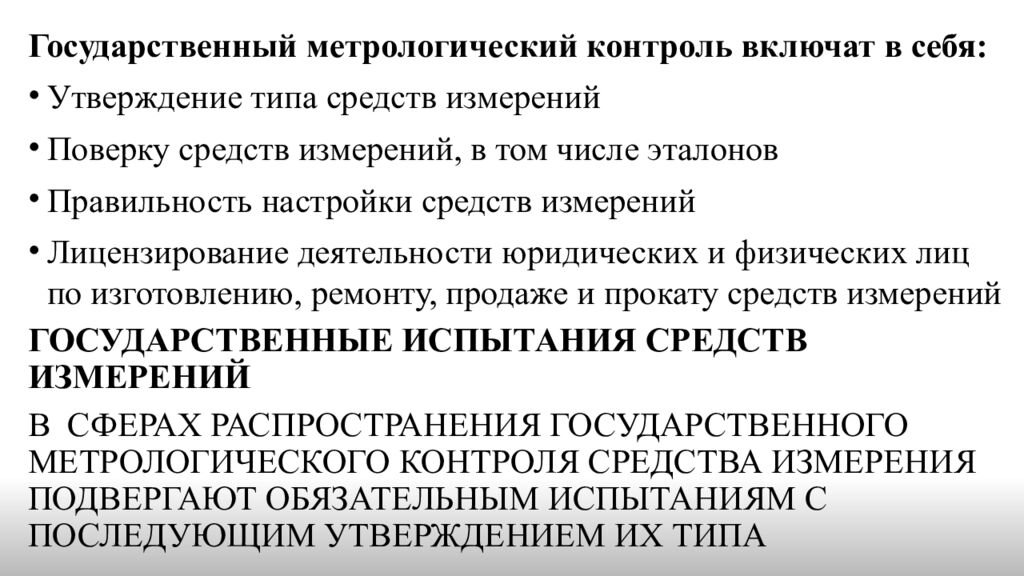 Государственный метрологический контроль включат в себя: Утверждение типа средств измерений Поверку средств измерений, в том числе эталонов Правильность настройки средств измерений Лицензирование деятельности юридических и физических лиц по изготовлению, ремонту, продаже и прокату средств измерений Государственные испытания средств измерений В сферах распространения государственного метрологического контроля средства измерения подвергают обязательным испытаниям с последующим утверждением их типа