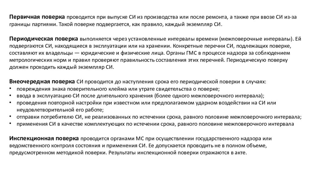 Первичная поверка проводится при выпуске СИ из производства или после ремонта, а также при ввозе СИ из-за границы партиями. Такой поверке подвергается, как правило, каждый экземпляр СИ. Периодическая поверка выполняется через установленные интервалы времени (межповерочные интервалы). Ей подвергаются СИ, находящиеся в эксплуатации или на хранении. Конкретные перечни СИ, подлежащих поверке, составляют их владельцы — юридические и физические лица. Органы ГМС в процессе надзора за соблюдением метрологических норм и правил проверяют правильность составления этих перечней. Периодическую поверку должен проходить каждый экземпляр СИ. Внеочередная поверка СИ проводится до наступления срока его периодической поверки в случаях : повреждения знака поверительного клейма или утрате свидетельства о поверке; ввода в эксплуатацию СИ после длительного хранения ( более одного межповерочного интервала); проведения повторной настройки при известном или предполагаемом ударном воздействии на СИ или неудовлетворительной его работе; отправки потребителю СИ, не реализованных по истечении срока, равного половине межповерочного интервала; применения СИ в качестве комплектующих по истечении срока, равного половине межповерочного интервала Инспекционная поверка проводится органами МС при осуществлении государственного надзора или ведомственного контроля состояния и применения СИ. Ее допускается проводить не в полном объеме, предусмотренном методикой поверки. Результаты инспекционной поверки отражаются в акте.