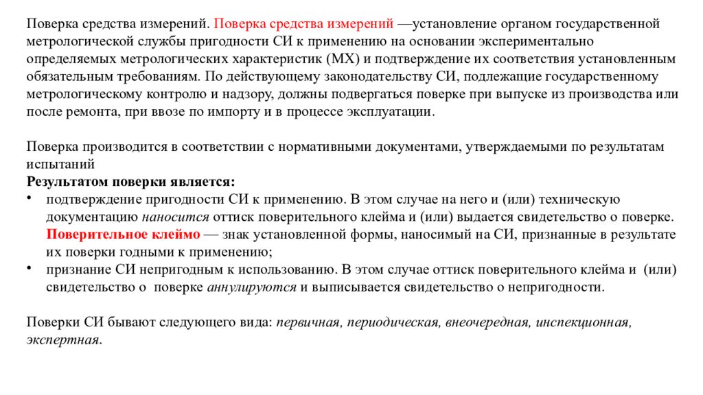 Поверка средства измерений. Поверка средства измерений —установление органом государственной метрологической службы пригодности СИ к применению на основании экспериментально определяемых метрологических характеристик (MX) и подтверждение их соответствия установленным обязательным требованиям. По действующему законодательству СИ, подлежащие государственному метрологическому контролю и надзору, должны подвергаться поверке при выпуске из производства или после ремонта, при ввозе по импорту и в процессе эксплуатации. Поверка производится в соответствии с нормативными документами, утверждаемыми по результатам испытаний Результатом поверки является: подтверждение пригодности СИ к применению. В этом случае на него и (или) техническую документацию наносится оттиск поверительного клейма и (или) выдается свидетельство о поверке. Поверительное клеймо — знак установленной формы, наносимый на СИ, признанные в результате их поверки годными к применению; признание СИ непригодным к использованию. В этом случае оттиск поверительного клейма и (или) свидетельство о поверке аннулируются и выписывается свидетельство о непригодности. Поверки СИ бывают следующего вида: первичная, периодическая, внеочередная, инспекционная, экспертная.