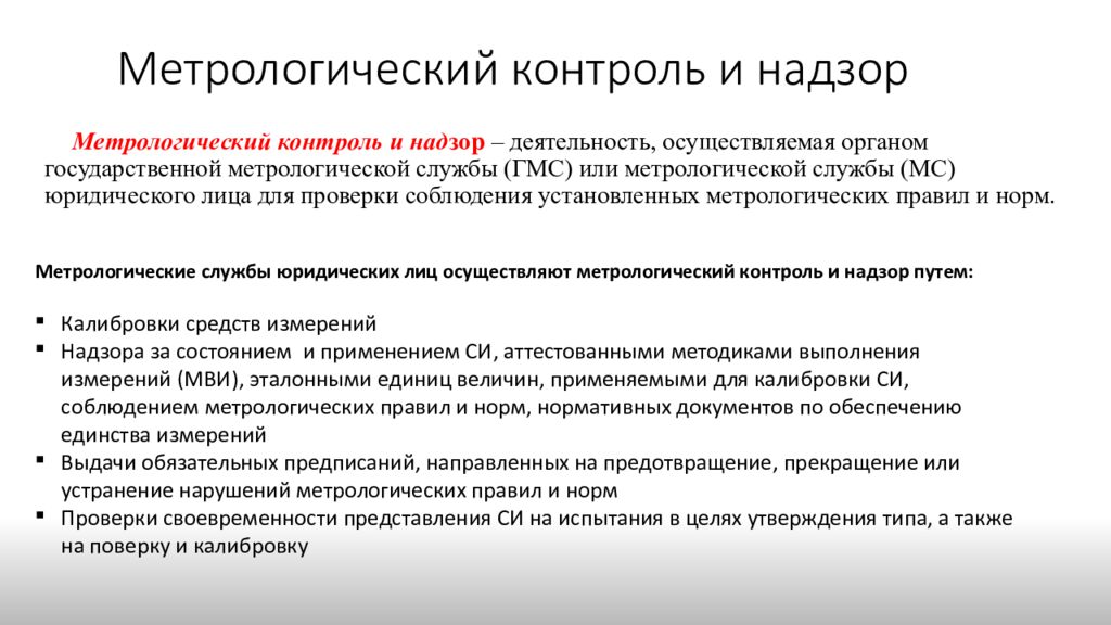 Метрологический контроль и над зор – деятельность, осуществляемая органом государственной метрологической службы (ГМС) или метрологической службы (МС) юридического лица для проверки соблюдения установленных метрологических правил и норм. Метрологические службы юридических лиц осуществляют метрологический контроль и надзор путем: Калибровки средств измерений Надзора за состоянием и применением СИ, аттестованными методиками выполнения измерений (МВИ), эталонными единиц величин, применяемыми для калибровки СИ, соблюдением метрологических правил и норм, нормативных документов по обеспечению единства измерений Выдачи обязательных предписаний, направленных на предотвращение, прекращение или устранение нарушений метрологических правил и норм Проверки своевременности представления СИ на испытания в целях утверждения типа, а также на поверку и калибровку