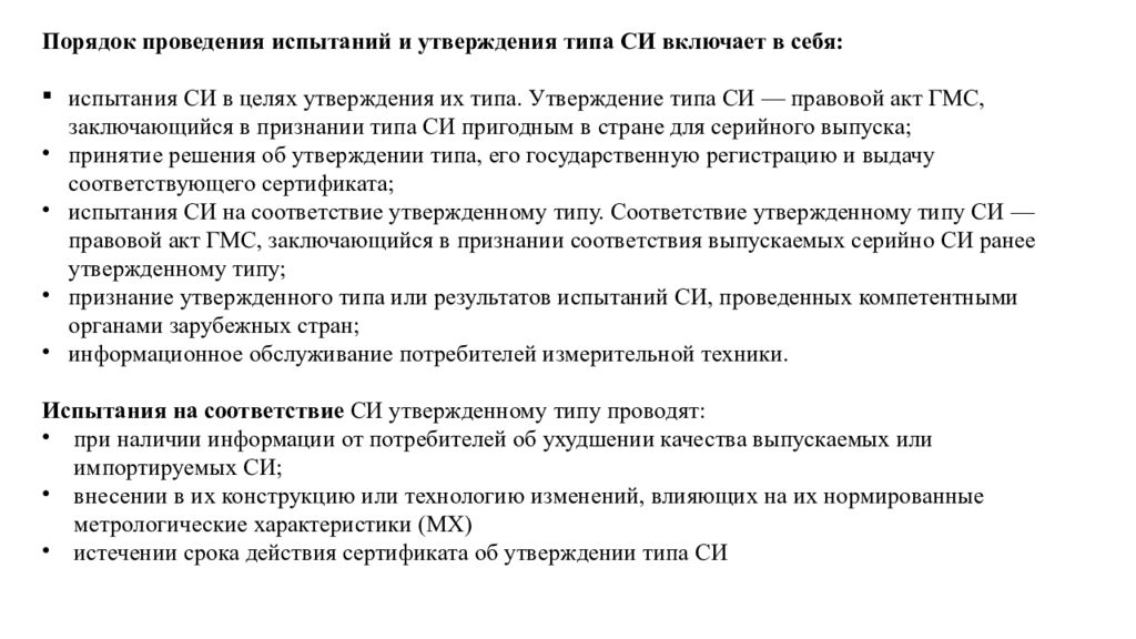 Порядок проведения испытаний и утверждения типа СИ включает в себя: испытания СИ в целях утверждения их типа. Утверждение типа СИ — правовой акт ГМС, заключающийся в признании типа СИ пригодным в стране для серийного выпуска ; принятие решения об утверждении типа, его государственную регистрацию и выдачу соответствующего сертификата ; испытания СИ на соответствие утвержденному типу. Соответствие утвержденному типу СИ — правовой акт ГМС, заключающийся в признании соответствия выпускаемых серийно СИ ранее утвержденному типу ; признание утвержденного типа или результатов испытаний СИ, проведенных компетентными органами зарубежных стран ; информационное обслуживание потребителей измерительной техники. Испытания на соответствие СИ утвержденному типу проводят: при наличии информации от потребителей об ухудшении качества выпускаемых или импортируемых СИ; внесении в их конструкцию или технологию изменений, влияющих на их нормированные метрологические характеристики (MX) истечении срока действия сертификата об утверждении типа СИ