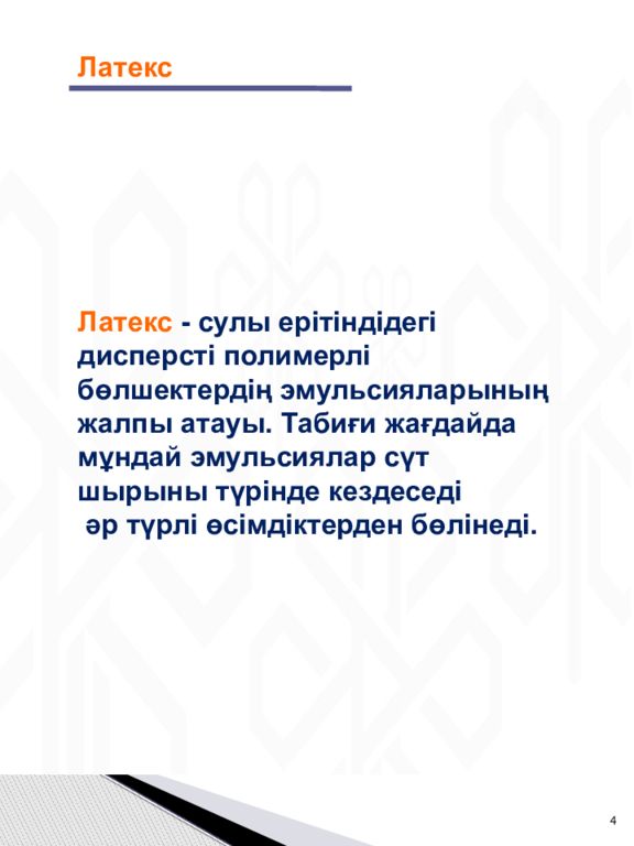 Латекс - сулы ерітіндідегі дисперсті полимерлі бөлшектердің эмульсияларының жалпы атауы. Табиғи жағдайда мұндай эмульсиялар сүт шырыны түрінде кездеседі әр түрлі өсімдіктерден бөлінеді. Латекс 4