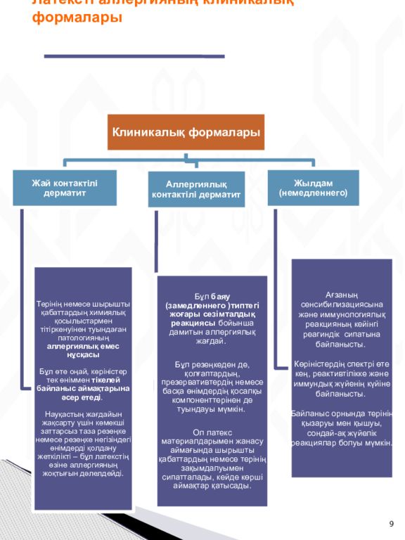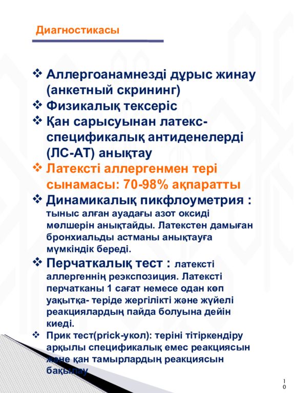 Аллергоанамнезді дұрыс жинау (анкетный скрининг) Физикалық тексеріс Қан сарысуынан латекс-спецификалық антиденелерді (ЛС-АТ) анықтау Латексті аллергенмен тері сынамасы: 70-98% ақпаратты Динамикалық пикфлоуметрия : тыныс алған ауадағы азот оксиді мөлшерін анықтайды. Латекстен дамыған бронхиальды астманы анықтауға мүмкіндік береді. Перчаткалық тест : латексті аллергеннің реэкспозиция. Латексті перчатканы 1 сағат немесе одан көп уақытқа- теріде жергілікті және жүйелі реакциялардың пайда болуына дейін киеді. Прик тест ( prick- укол): теріні тітіркендіру арқылы спецификалық емес реакциясын және қан тамырлардың реакциясын бақылау Диагностикасы 10