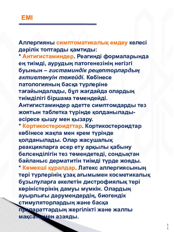 Аллергияны симптоматикалық емдеу келесі дәрілік топтарды қамтиды: * Антигистаминдер. Реагинді формаларында ең тиімді, аурудың патогенезінің негізгі буынын – гистаминдік рецепторлардың активтенуін тежейді. Көбінесе патологияның басқа түрлеріне тағайындалады, бұл жағдайда олардың тиімділігі біршама төмендейді. Антигистаминдер әдетте симптомдарды тез жоятын таблетка түрінде қолданылады-әсіресе қышу мен қызару. * Кортикостероидттар. Кортикостероидтар көбінесе жақпа мен крем түрінде қолданылады. Олар жасушалық реакцияларға әсер ету арқылы қабыну белсенділігін тез төмендетеді, сондықтан байланыс дерматитін тиімді түрде жояды. * Көмекші құралдар. Латекс аллергиясының тері түрлерінің ұзақ ағымымен косметикалық бұзылуларға әкелетін дистрофиялық тері көріністерінің дамуы мүмкін. Олардың ауырлығы дәрумендердің, биогендік стимуляторлардың және басқа препараттардың жергілікті және жалпы мақсатымен азаяды. ЕМІ 11