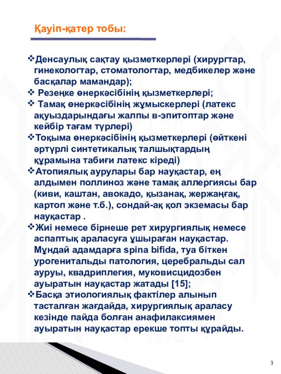 Қауіп-қатер тобы: 3 Денсаулық сақтау қызметкерлері (хирургтар, гинекологтар, стоматологтар, медбикелер және басқалар мамандар); Резеңке өнеркәсібінің қызметкерлері; Тамақ өнеркәсібінің жұмыскерлері (латекс ақуыздарындағы жалпы в-эпитоптар және кейбір тағам түрлері) Тоқыма өнеркәсібінің қызметкерлері (өйткені әртүрлі синтетикалық талшықтардың құрамына табиғи латекс кіреді) Атопиялық аурулары бар науқастар, ең алдымен поллиноз және тамақ аллергиясы бар (киви, каштан, авокадо, қызанақ, жержаңғақ, картоп және т.б.), сондай-ақ қол экземасы бар науқастар. Жиі немесе бірнеше рет хирургиялық немесе аспаптық араласуға ұшыраған науқастар. Мұндай адамдарға spina bifida, туа біткен урогенитальды патология, церебральды сал ауруы, квадриплегия, муковисцидозбен ауыратын науқастар жатады [15]; Басқа этиологиялық фактілер алынып тасталған жағдайда, хирургиялық араласу кезінде пайда болған анафилаксиямен ауыратын науқастар ерекше топты құрайды.
